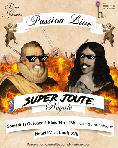 - Samedi 11 Octobre à Blois : enregistrement d’un épisode « Passion Modernistes – Super Joute Royale, Henri IV vs Louis XIII » lors des Rendez-vous de l’histoire à Blois, 14h à 16h à la Cité du numérique (5/11 avenue de Vendôme) (réservation sur le site du festival)